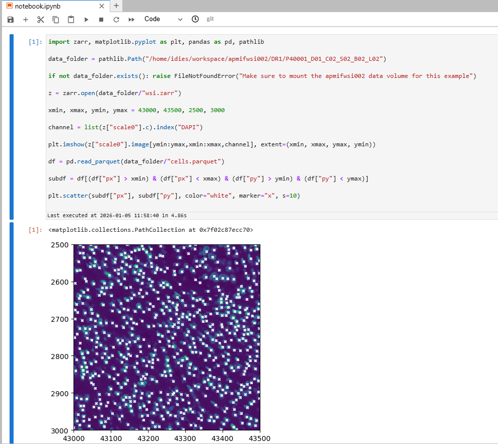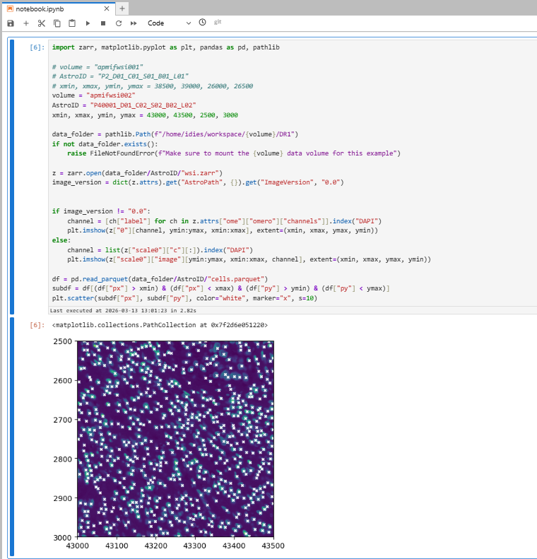 Below is a minimal example of code from a Jupyter notebook to show a small area of the slide image, with each cells marked with an “x”. You can paste it directly into your notebook. This example requires selecting the apmifwsi002 volume at the time of container creation. The screenshot below shows the expected output.