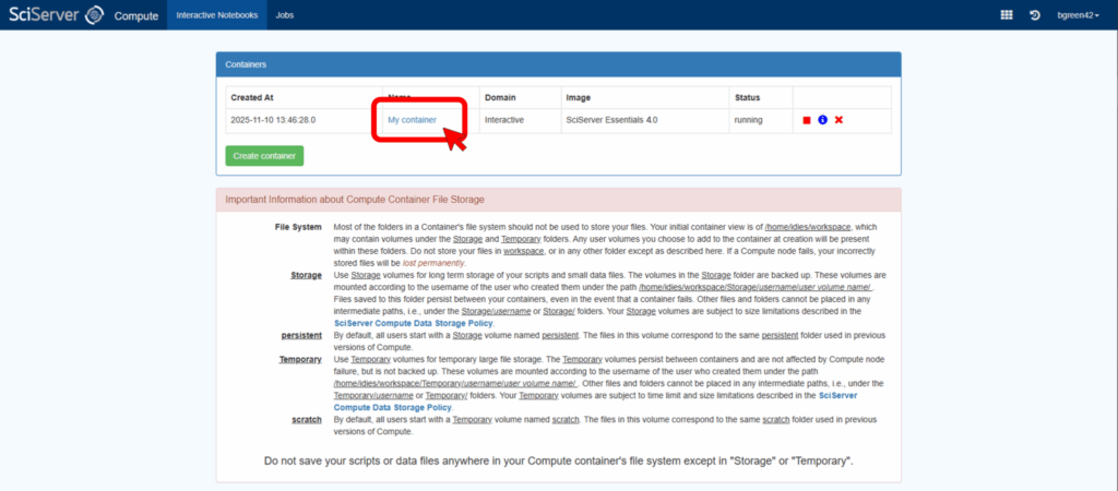 Before creating a container, please take a moment to note the information regarding file storage at the bottom of the Compute page. These details may not make perfect sense now but will become important in the future. Essentially, you have access to a few different folders in the container, but when and how long files will exist may change over time depending on where it is saved.