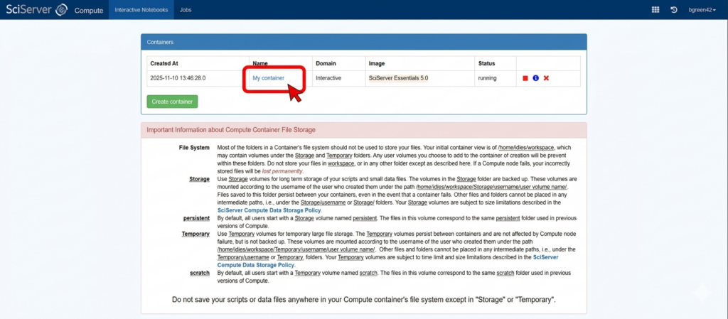 Before creating a container, please take a moment to note the information regarding file storage at the bottom of the Compute page. These details may not make perfect sense now but will become important in the future. Essentially, you have access to a few different folders in the container, but when and how long files will exist may change over time depending on where it is saved.