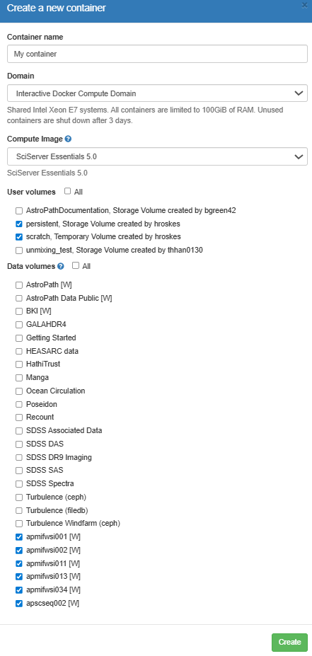 A window will open with options for how to initialize the container – see the image below for an example of what it may look like. In this window, give the container a unique name under Container name and leave the Domain option as it is. For the Compute Image use SciServer Essentials 5.0. Under Data Volumes, select the datasets you want access to. The AstroPath volumes all start with “ap” (e.g. “apmifwsi002”, “apmifwsi011”, etc). Finally click Create in the lower right-hand corner.