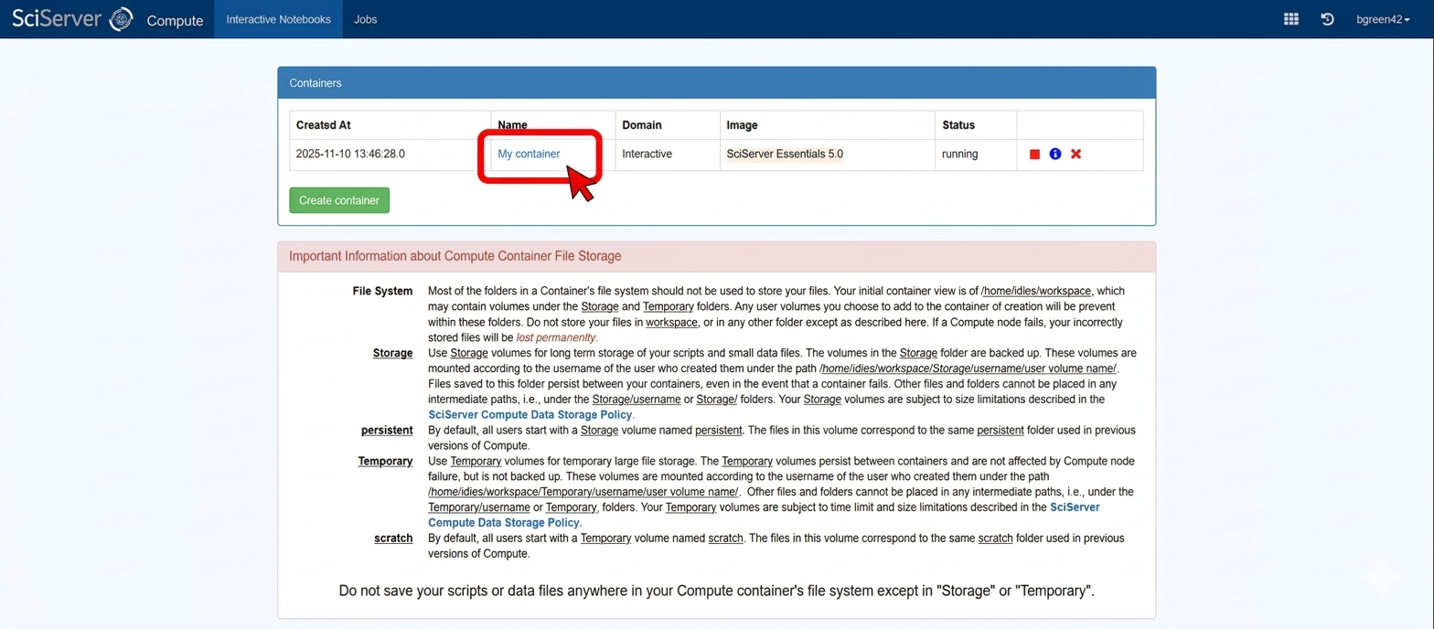 Before creating a container, please take a moment to note the information regarding file storage at the bottom of the Compute page. These details may not make perfect sense now but will become important in the future. Essentially, you have access to a few different folders in the container, but when and how long files will exist may change over time depending on where it is saved.