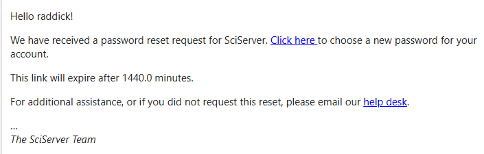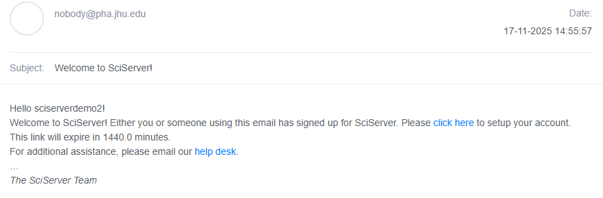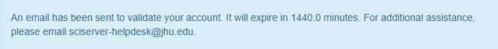 An email has been sent to validate your account. It will expire in 1440.0 minutes. For additional assistance, please email sciserver-helpdesk@jhu.edu.