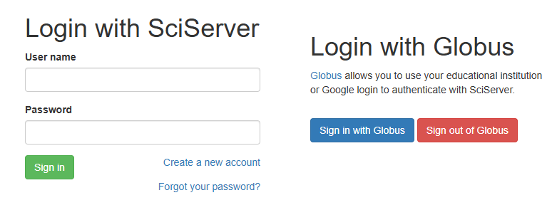 SciServer login control, offering options to log in with SciServer and Globus