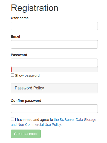 5. At the Registration page, enter the following:The SciServer new account registration form, asking for User name, Email, Password, and Confirm password